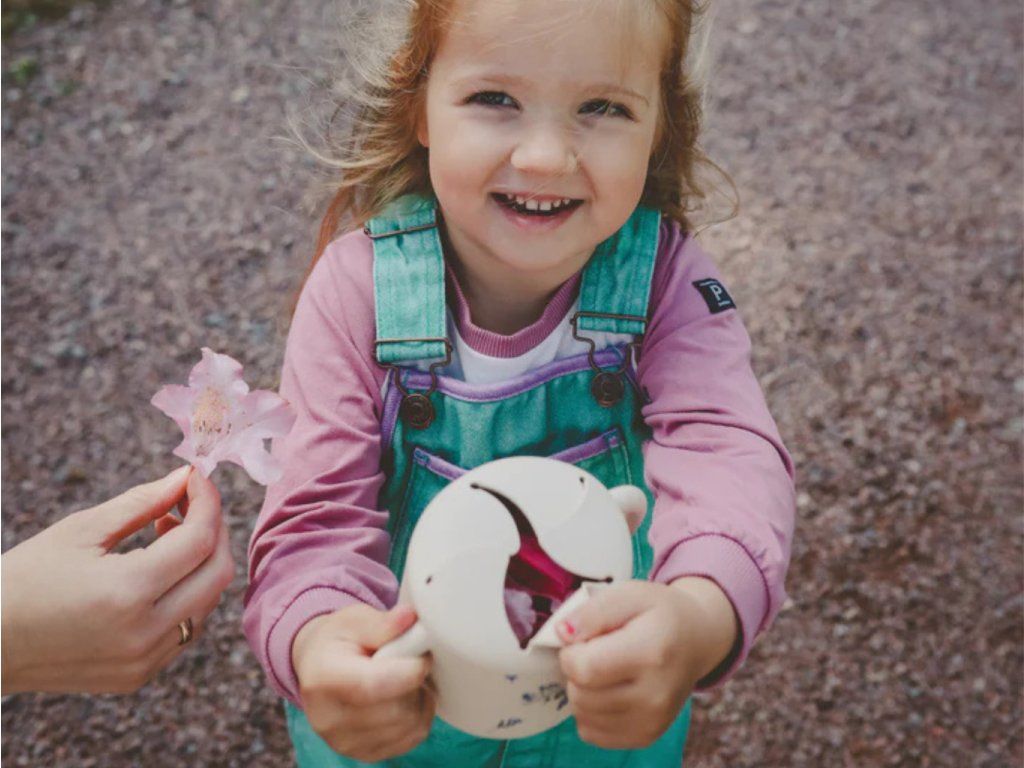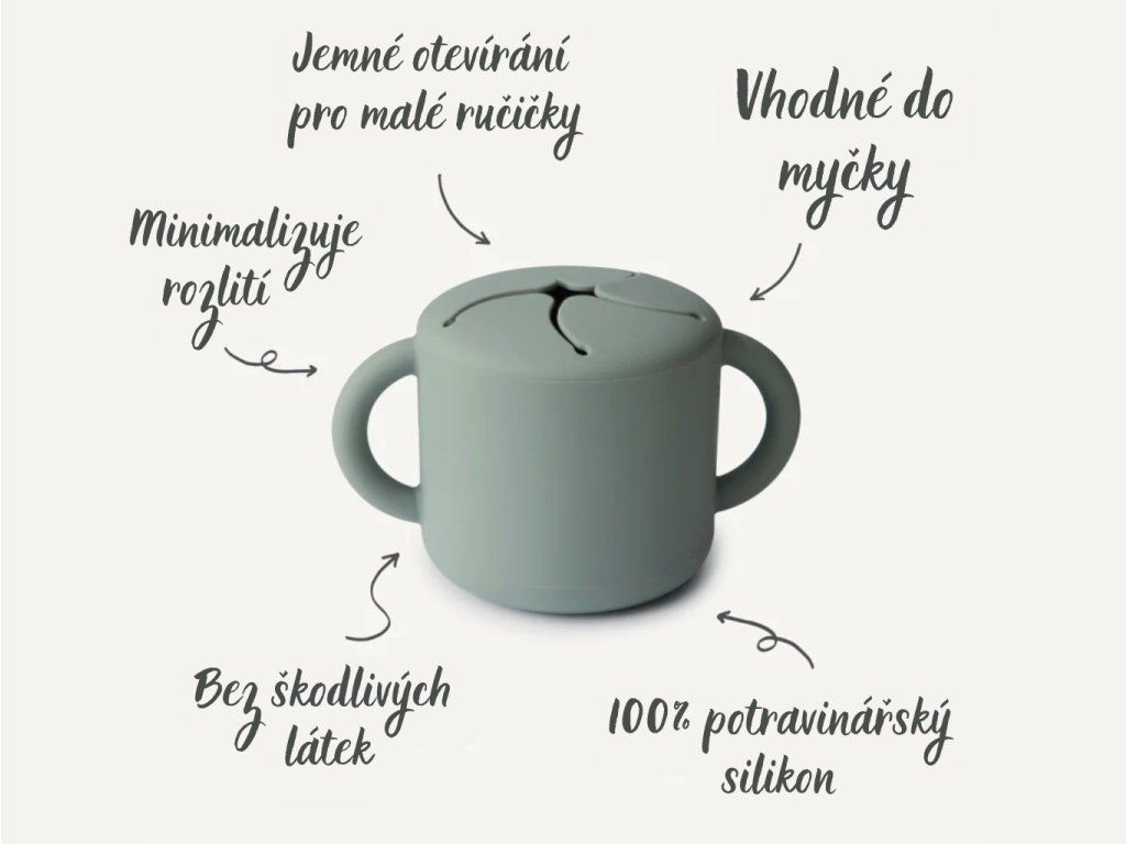 Minimalistický silikonový pohárek na svačinu, který podporuje samostatnost dítěte a udrží pořádek doma i na cestách.